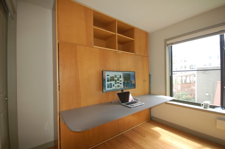 This is a queen horizontal wall bed with floating desk and mounted monitor on the face. There is also the cabinetry above the bed. It is a teak finish.